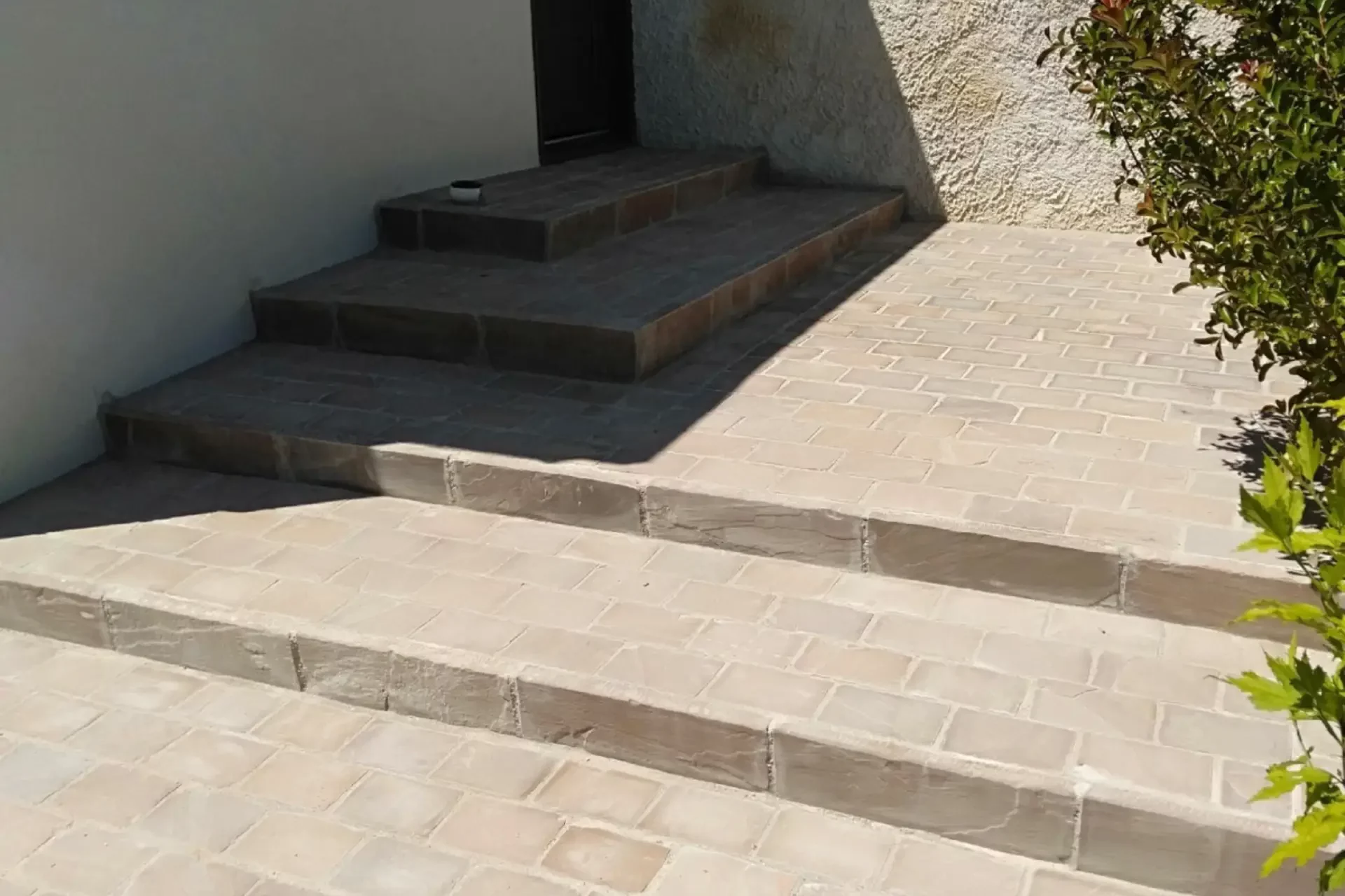En complément, nous avons conçu et réalisé une entrée de maison surélevée comprenant 4 marches en grès d’Inde, bordées de pavés Kandla pour une finition soignée et harmonieuse. Cet aménagement permet une transition fluide entre l’extérieur et l’entrée de la maison, tout en apportant une touche architecturale raffinée.