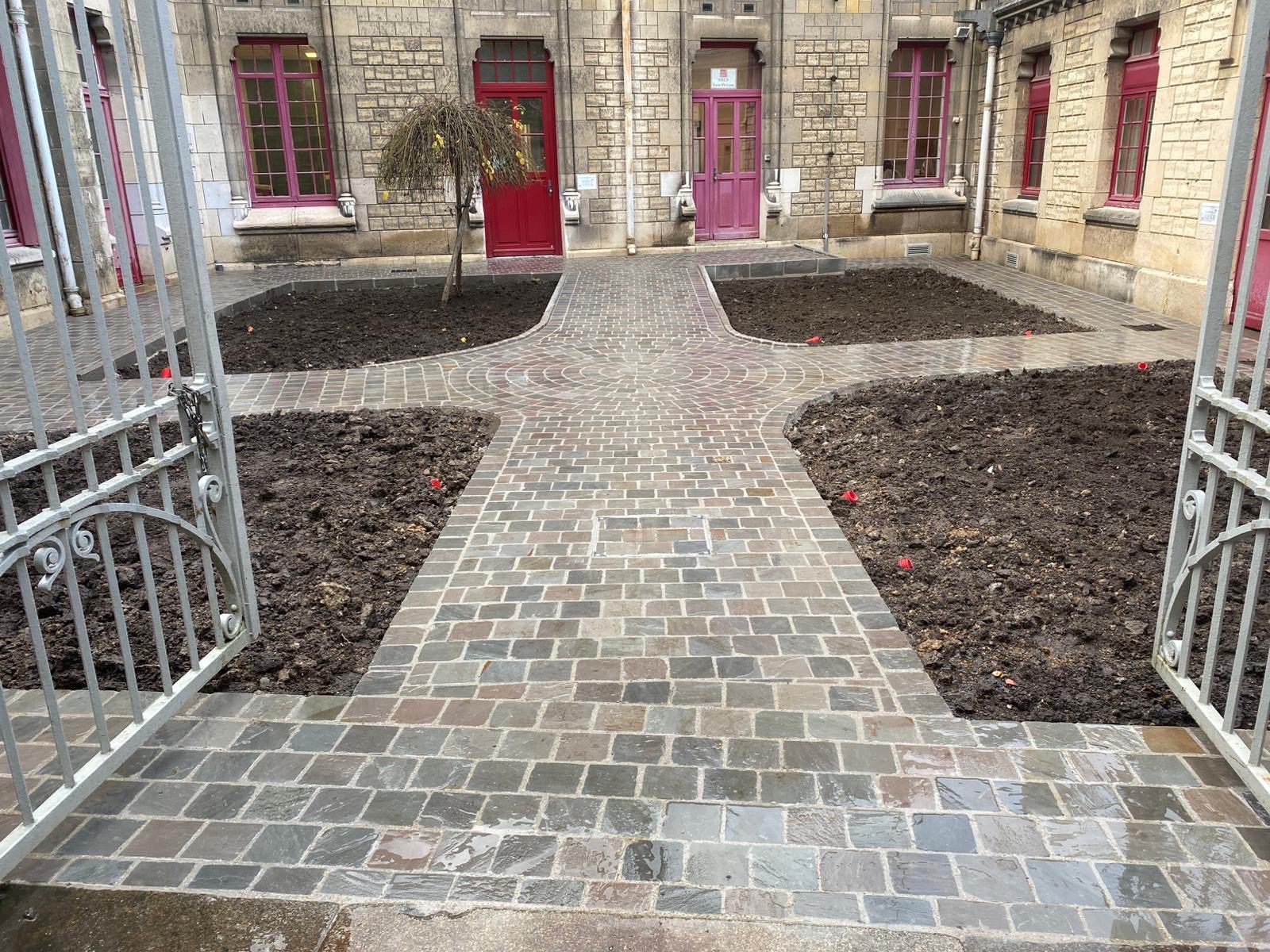 Cour pavée en pierre naturelle devant portail à Rungis